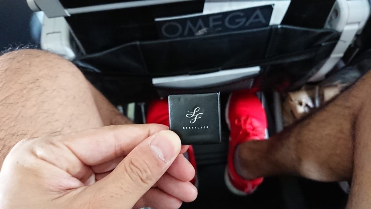 外観の写真撮り忘れましたけど、今回はスターフライヤーの便に乗りました。以前、出張で乗ってから好きになった会社です。ANAのマイル貯めてるのでANA経由の予約ですが、とにかく座席の広さがいいんです。僕でかいので。