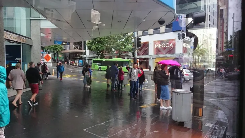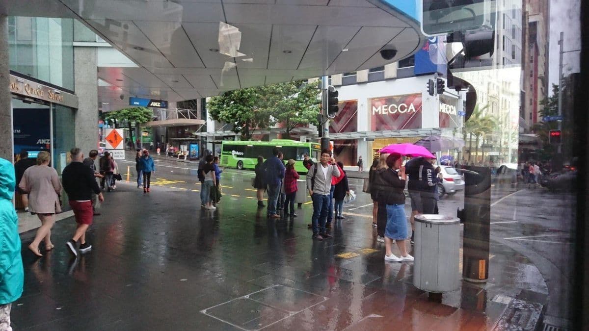 あんなに快晴だったクイーンズタウンから、オークランドに降り立つと雨。バスで市内中心部に向かいますが、目に映る風景はこれまでと比べてあきらかに都会でした。