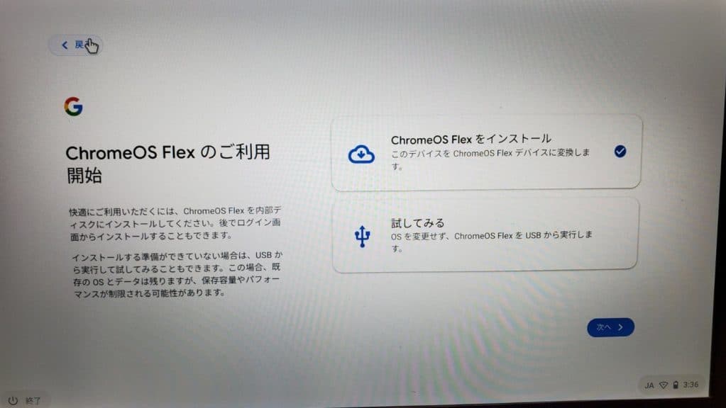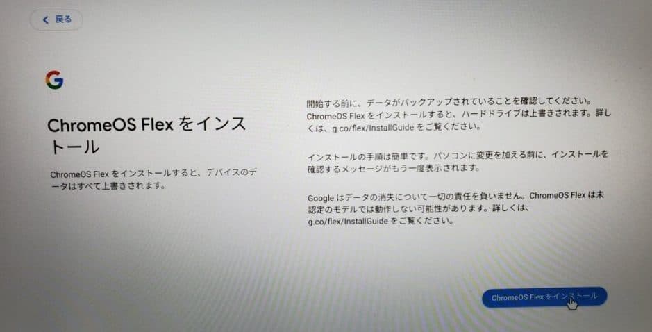 基本的には[公式サイト](https://support.google.com/chromeosflex/answer/11552529?hl=ja)に書いてあるとおりにインストーラーUSBを用意したら、BIOSで立ち上げてPCに挿すだけ。BIOSはこのVAIOのばあいF3押しながら電源ボタン押せば立ち上がります。