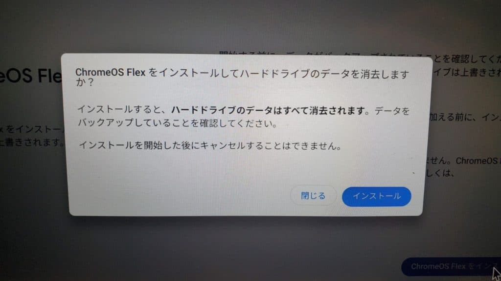 インストールすると、中のハードドライブのデータは全部消えるので注意。もうすでに消えて困るようなデータは入っていないので、この機会にクリーンアップです。