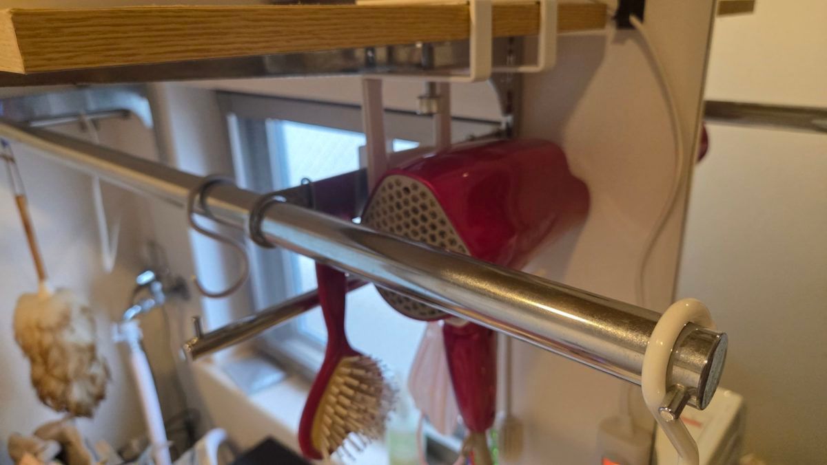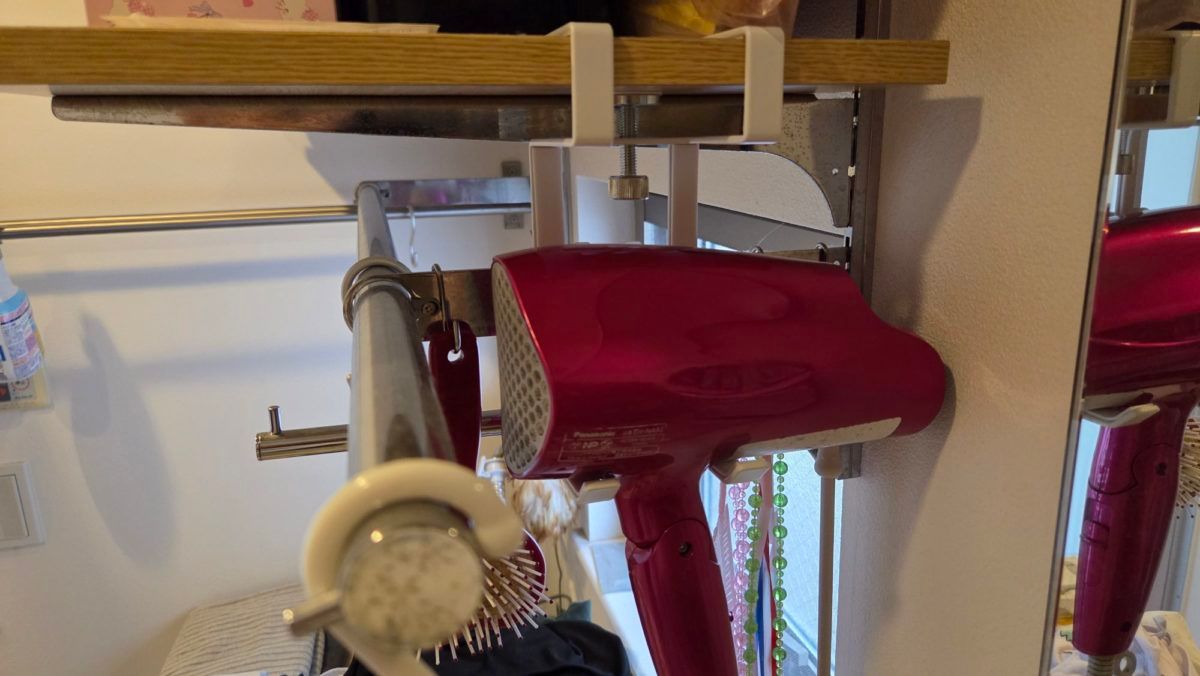 で、置き場を色々と検討してたんですけど、ドライヤーって結構存在感あって、ウチのドライヤーが赤いせいもあるけど、フックにぶら下げると目について邪魔が勝る。というか、ぶら下げる行為が意外に面倒だったりする。