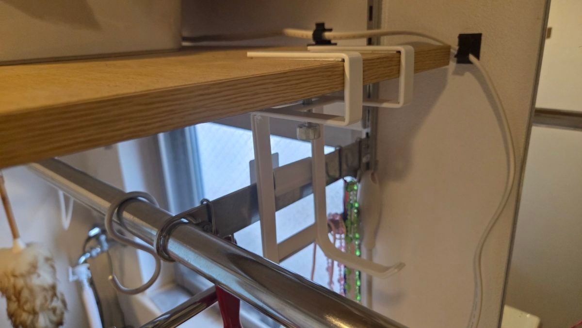 洗面台に隣接している洗濯機の上部スペースに、タオルや洗剤のストックを置けるように棚を自作していて、その下にいろいろ引っ掛けられるようにポールを渡してあるんだけど、ちょうどその裏側のデッドスペースに設置。