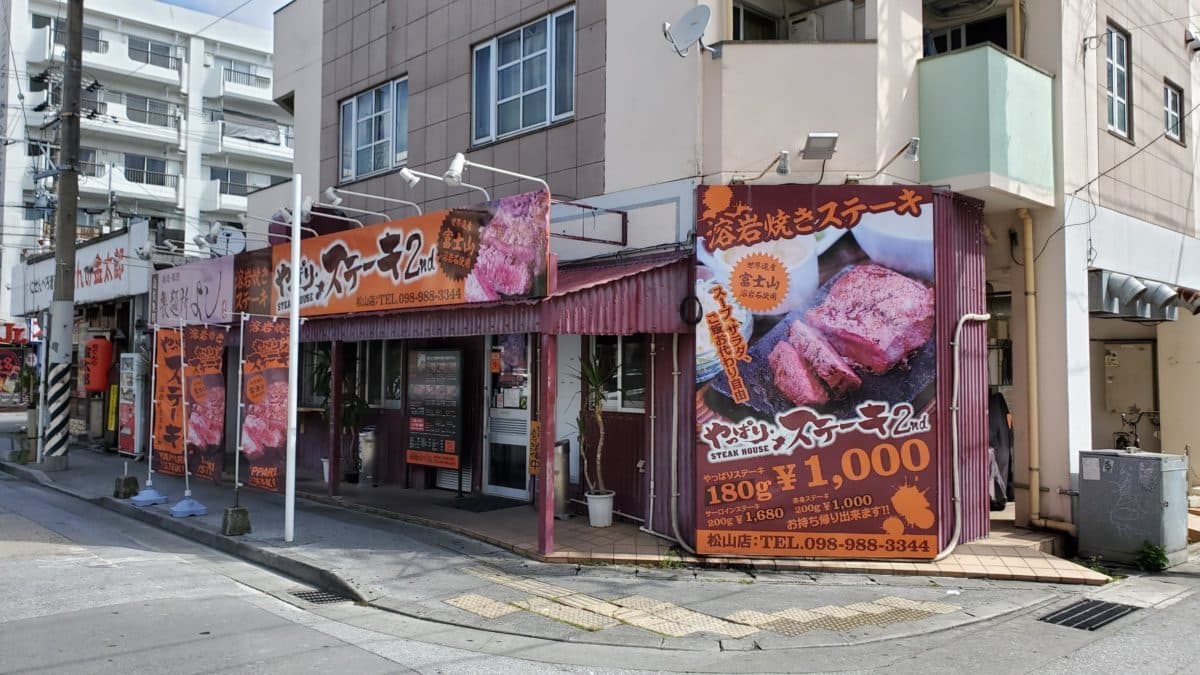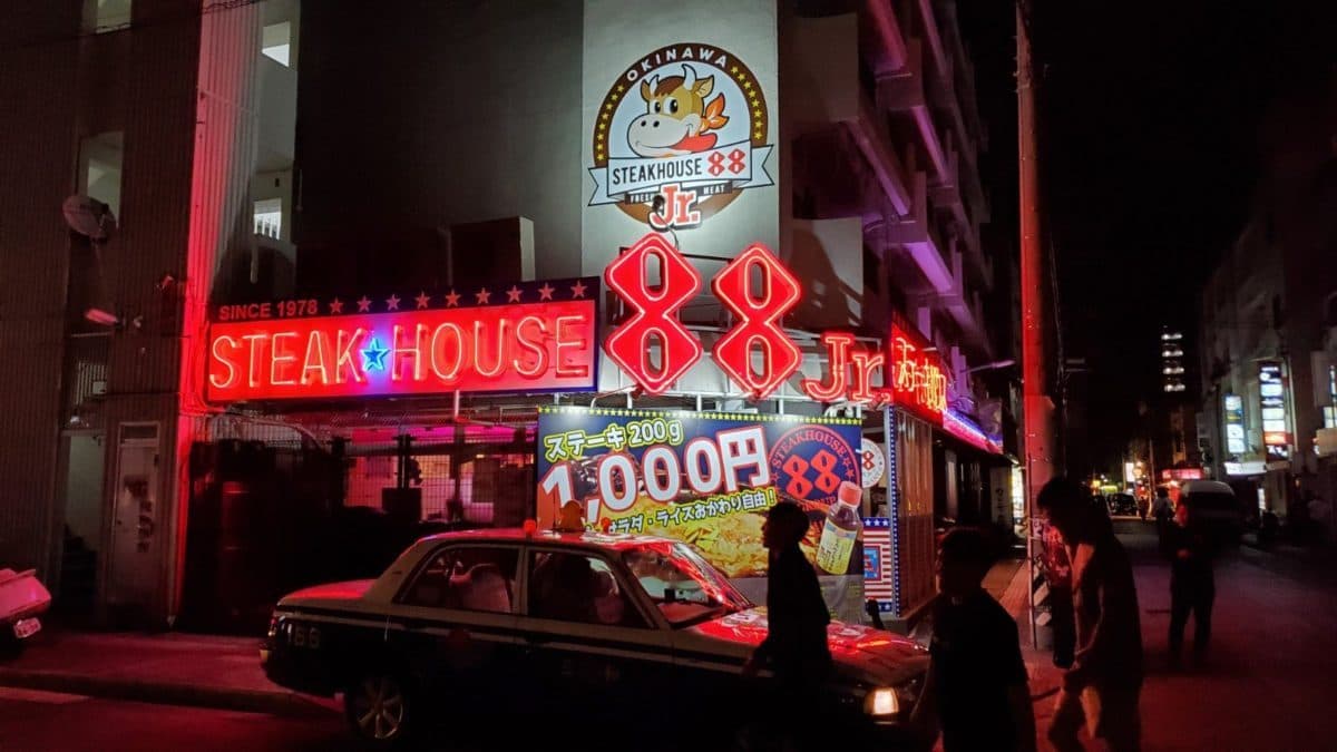 やってきたのはホテルから数秒の距離にある「ステーキハウス88Jr」。この2件隣には「やっぱりステーキ」というライバル店が鎮座しております。東京からくるとこの店名がアレを連想させるわけですが、180g1000円のステーキを看板に、わずか数年で沖縄県民のハートをわしづかみにした、超人気店らしいです。