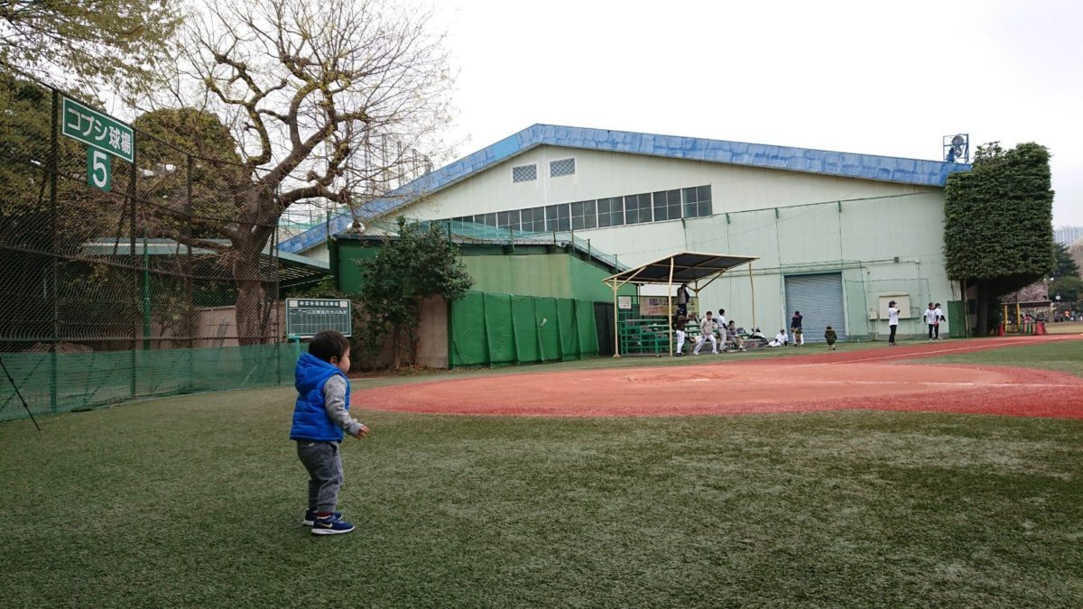 このコブシ球場は人工芝なので、子供を遊ばせても汚れなくていいですね。イチローの影響なのか、息子もそこそこテンション高くボールを追いかけ、そこそこのコントロールで投げ返せます。ほぼ左で投げてたけど、もしかしたら左利きが確定なのかしら。