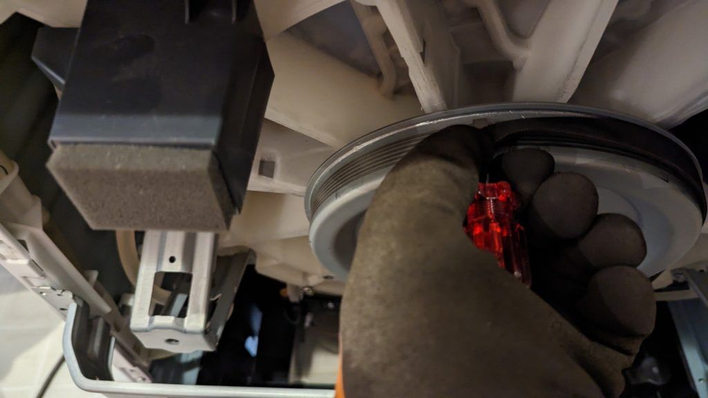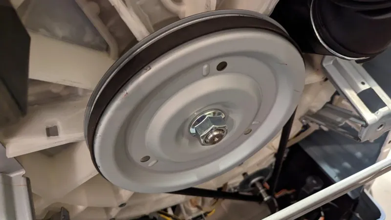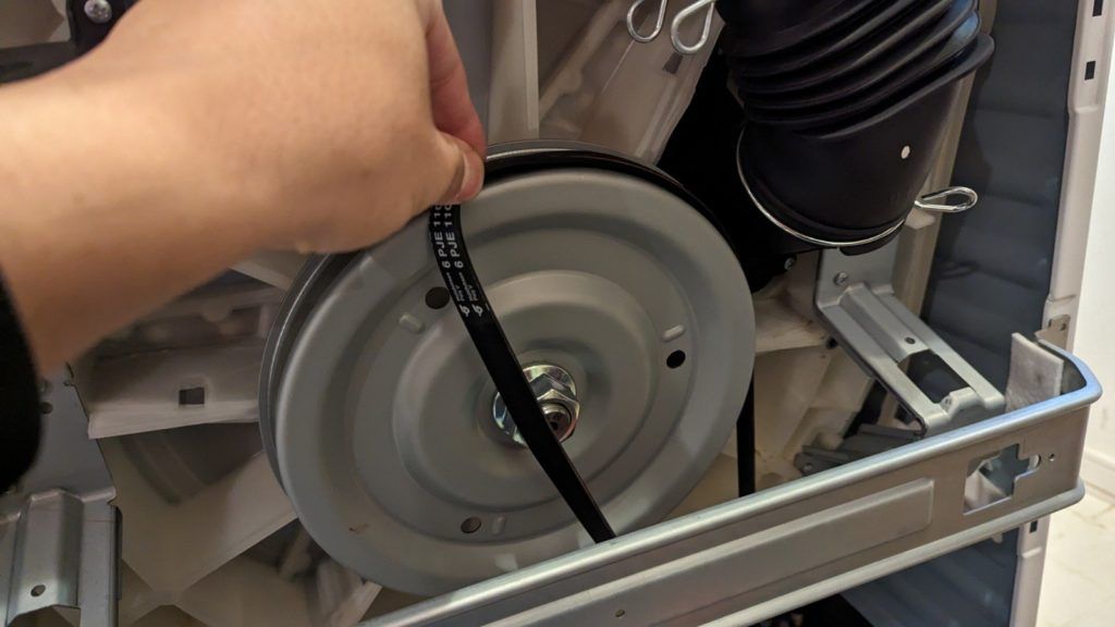 洗濯機下部のモーターと洗濯槽側のプーリーにベルトを渡すだけなのですが、この新品ベルトがめちゃ硬くて全然入る気がしません。ベルトをプーリーに引っ掛けながら、プーリーを回す力でベルトを伸ばしながら入れていく感じです。