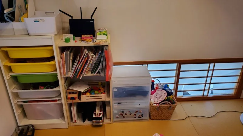 我が家はリビングに隣接した和室を子供の遊び場(兼、部屋干し場)としていまして、部屋の一角におもちゃや絵本を置いています。