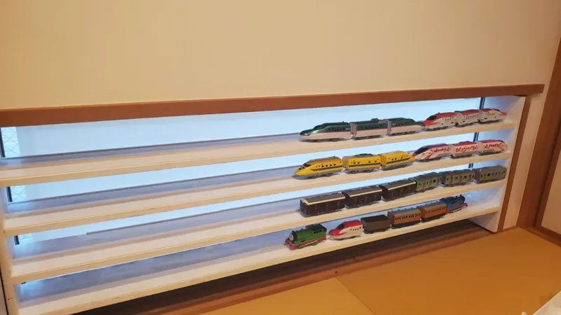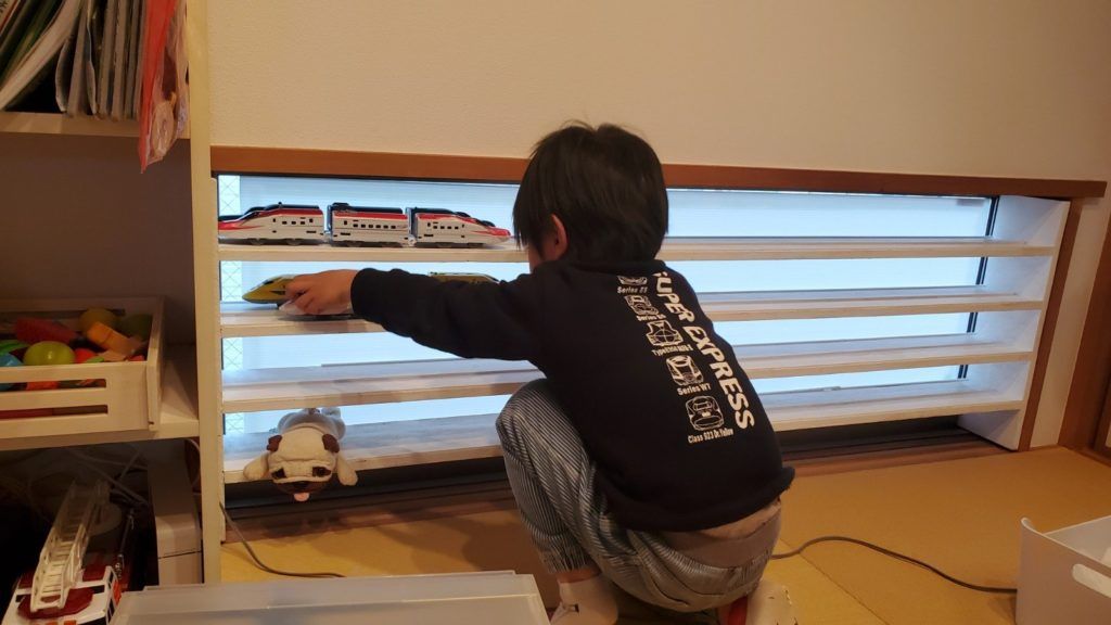 収納棚の設置後は、プラレールを飾ることも遊びの一つとして楽しんでいるようです。並べ方にも彼なりのこだわりがあるようで。