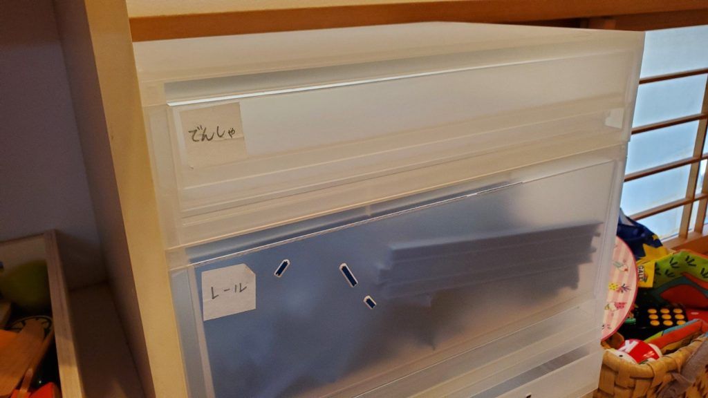 収納場所はこれまで無印良品のケースに入れていました。サイズがちょうどいいとネットで評判になっていたのをマネしているのですが、車両を一度バラさないと入れられないため、子どもはもちろん親も毎回しまうのが面倒に。