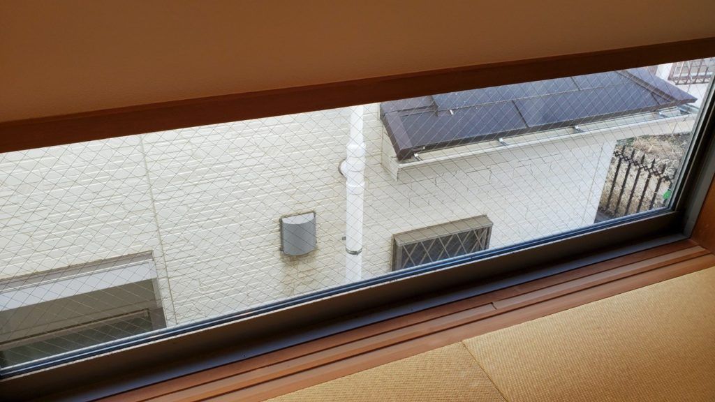 窓がこのままだと、棚を設置しても隣から丸見え状態なので、半透明のプラダンを切って両面テープで貼り付けます。これで目隠しと断熱の両方の効果が。