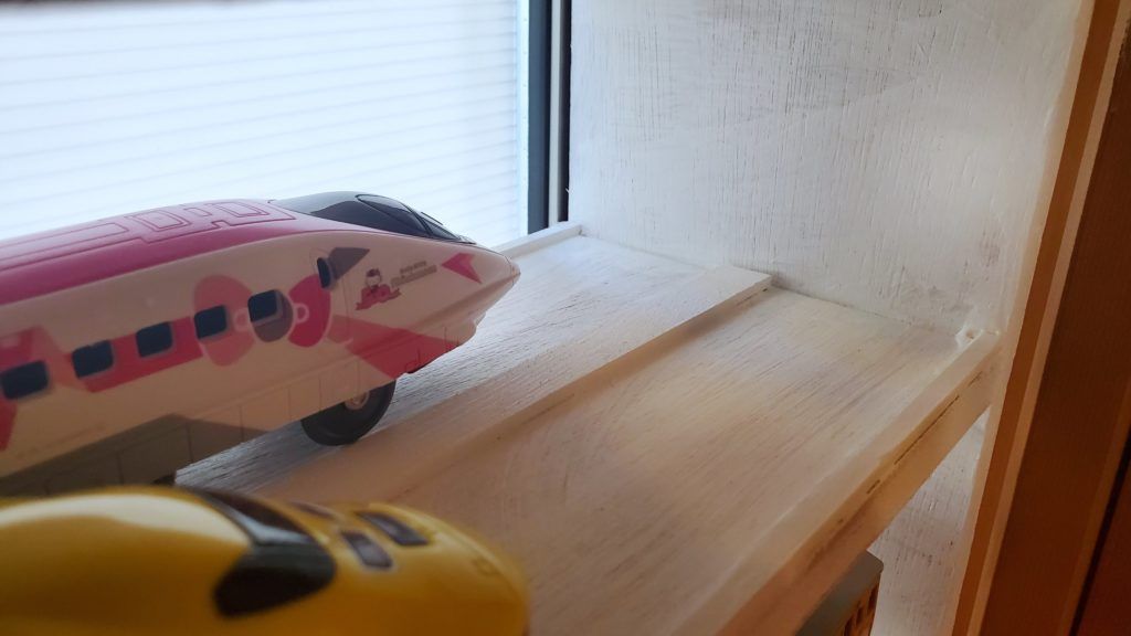 ランバーコアも強くて曲がりにくい木材とのことですが、横幅150㎝もあるので、強度を考えると真ん中に支えを入れたいところです。真ん中で力をかけると結構しなりますが、プラレール用ということで、重いのを乗せそうにないしまぁ大丈夫かなということで支えは入れていません。設置場所的に上から体重をかけることもないでしょうし。