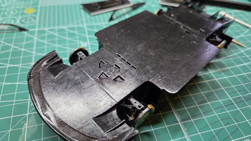 ディテールアップパーツを購入しているので、エッチングパーツと共に大量のカーボンデカールが付いています。そのためシャシー裏側は全面カーボンを表現できます。
