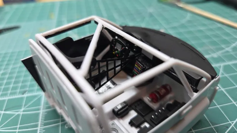 室内はホワイトとセミグロスブラックのシンプルな配色指示。ドアパネルと背面パネルにはカーボンデカールがあるけど、全体的に単調なので補器類を少し色変更。とはいえここもこだわった所で見えなくなるので、ただ自己満足のみですが。