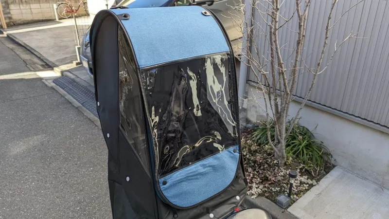 機能的にラボクルはよかったのですが、色落ち問題はやはり気になるのでチェンジ。雨ざらしの環境は同じなのでビニールの面積もできるだけ小さいほうが良いと考えました。乗っている子供にとっては開放感がないかもしれませんが、ある程度成長してくるとそこまで気にしてないんじゃないかと。