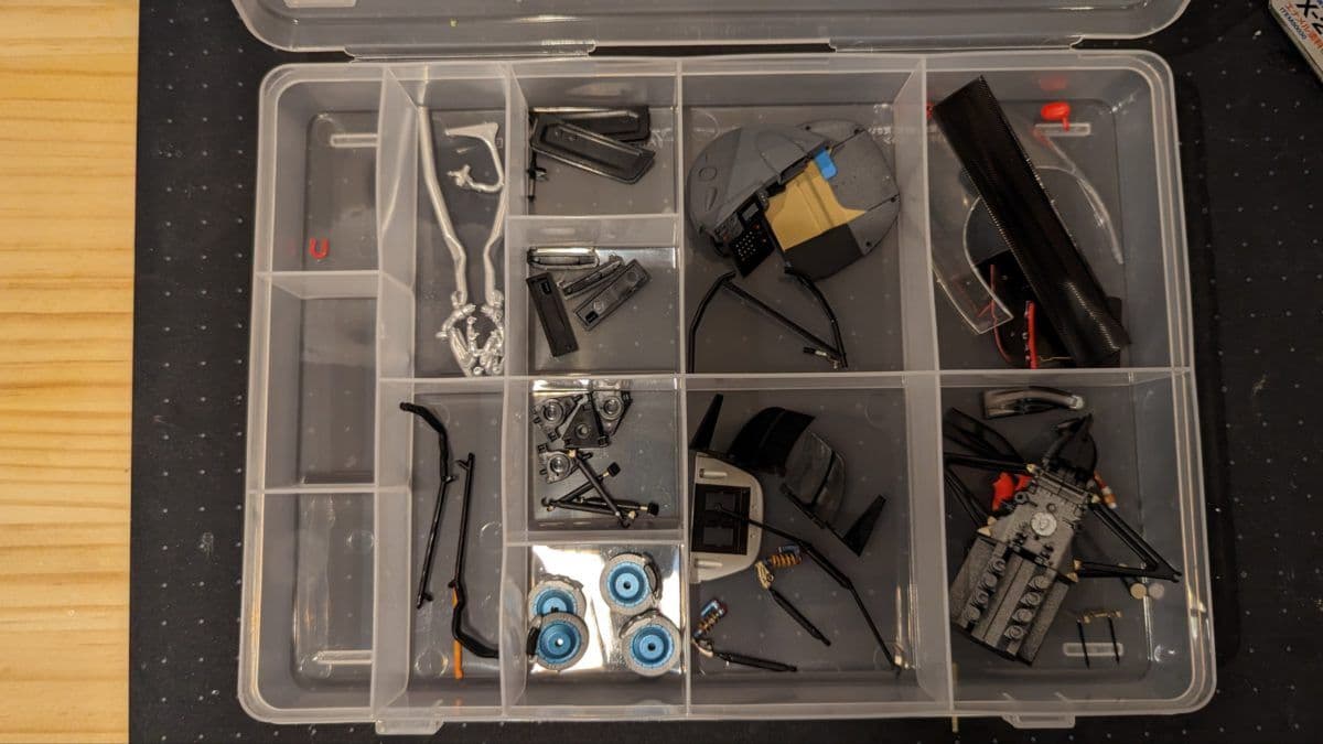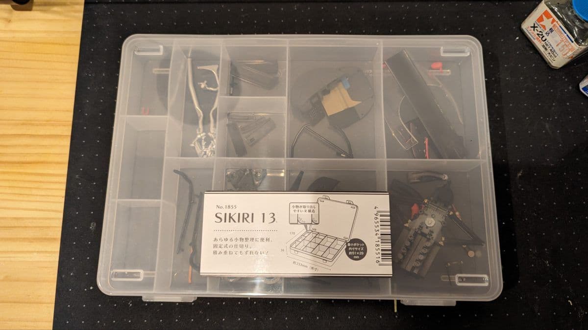 ランナーから切り出して塗装済みのパーツを入れるケースを100均で購入しました。仕切りの大きさが様々なので大きなパーツから細かいパーツまでの分類が楽になりました。これまではジップロックだったからなぁ。