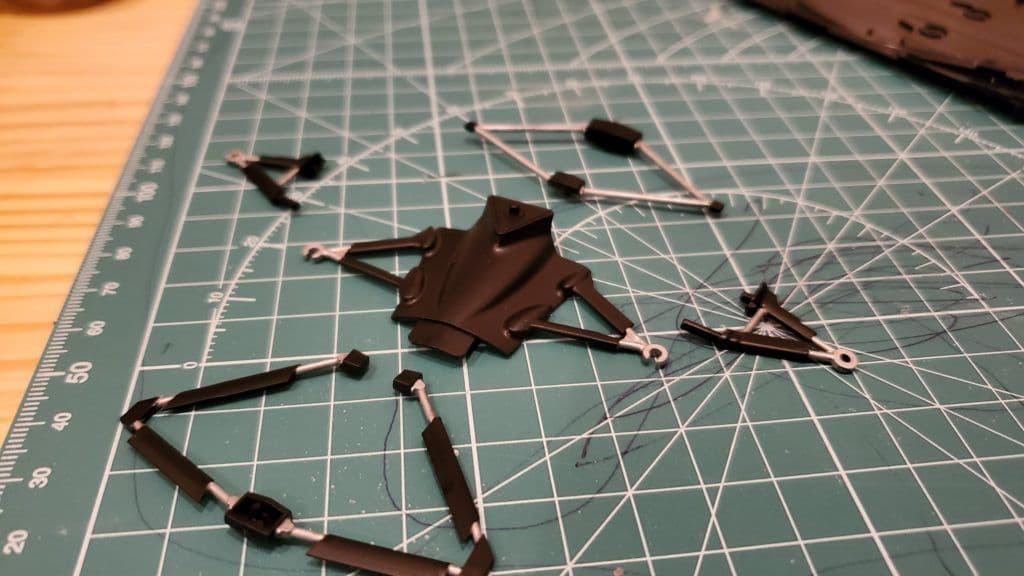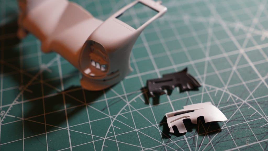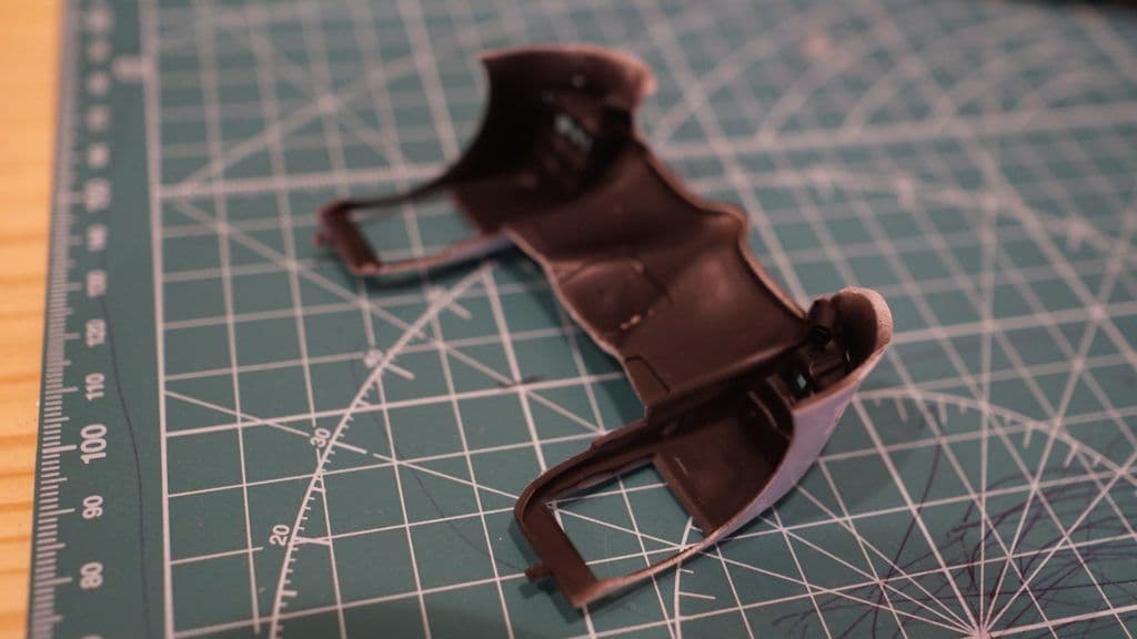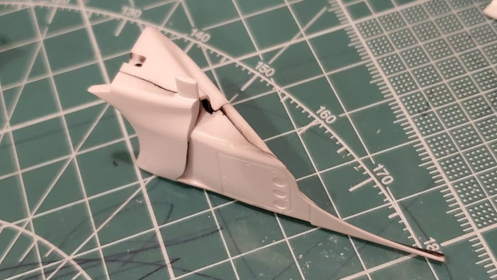乾いたら、組めるところを接着していきます。この写真はフロントフェンダー後方のパーツですが、これだけで4つのパーツに分かれていて、現代マシンの複雑な空力構造がわかります。あと、きれいに塗れてないこともわかります。