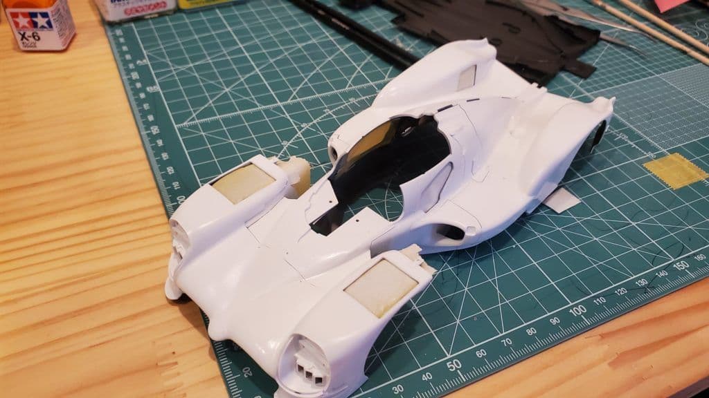 ボディのホワイト塗装、2回目です。同じように塗っていても、ボディパーツごとの微妙な色の違いや、十分に塗れていない境目部分などがあるので、その解消も目的に、ボディを一体化させて塗装していきます。