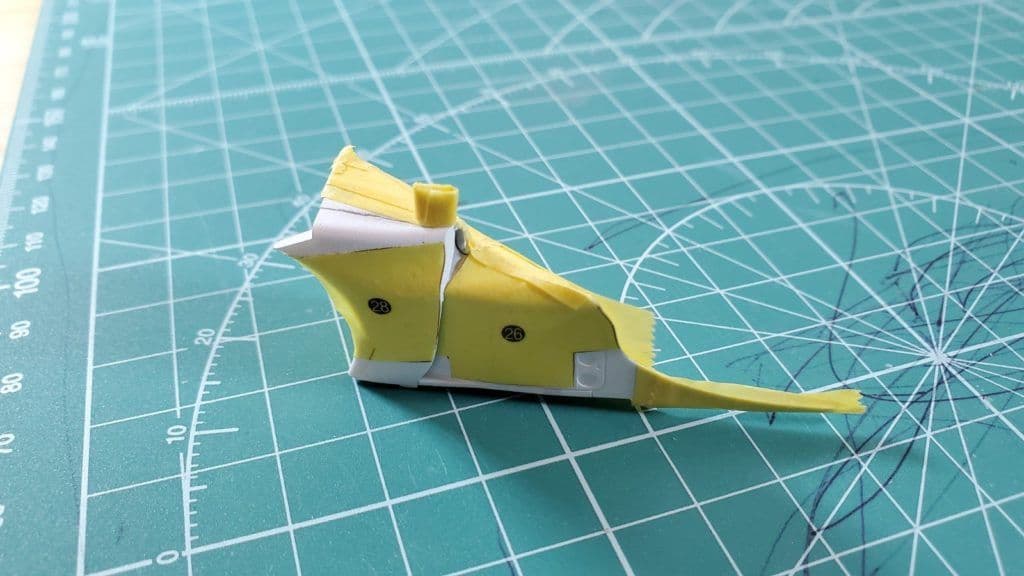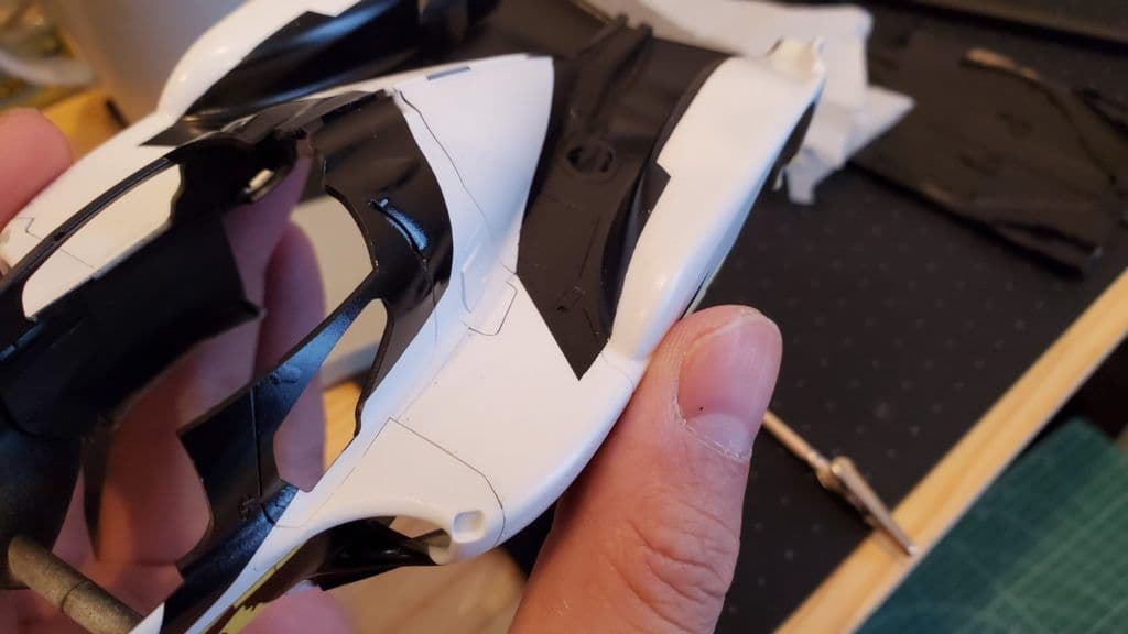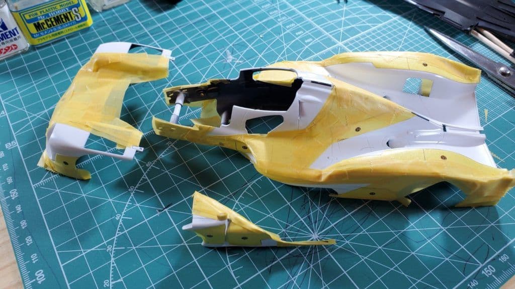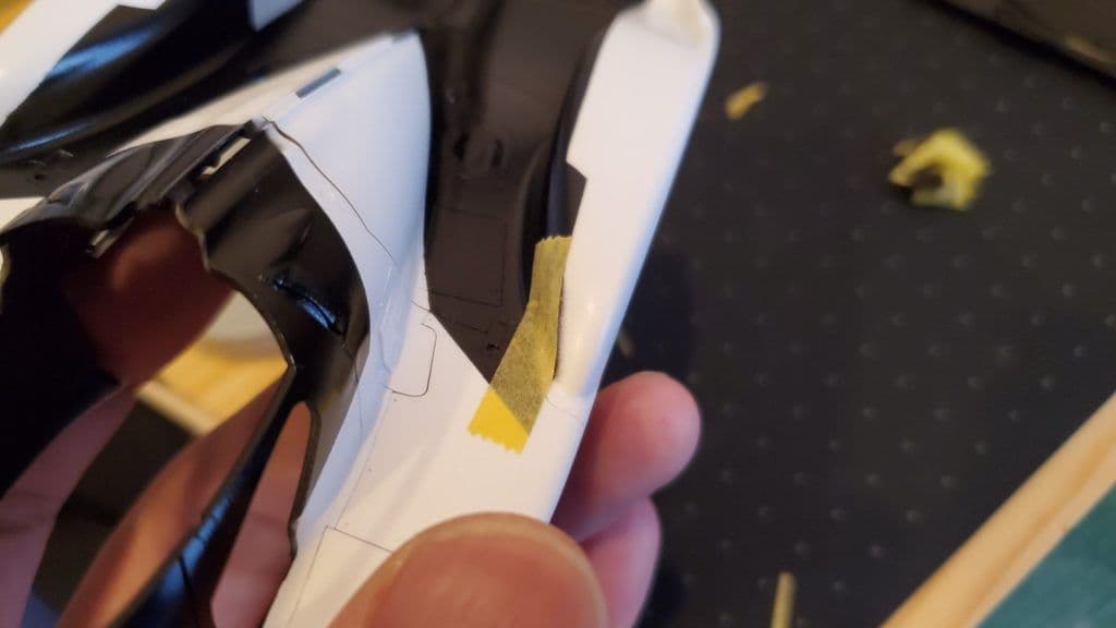 分割したパーツとの連続性とか確認しながら、マスク漏れのないようにします。連続してセミグロスブラック部分も塗る予定なので、一部マスキングテープもそのまま残せるように工夫して貼っていきます。